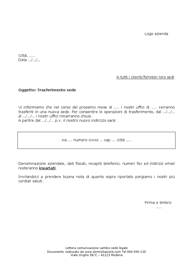 Modello lettera trasferimento sede legale Lettera trasferimento sede legale Il trasferimento della sede legale di una società di capitali, di una società di persone, di un consorzio, indipendentemente se questo avvenga nello stesso comune, nella stessa provincia o regione impone alla società la comunicazione ai fornitori della nuova sede, del nuovo indirizzo della sede legale.