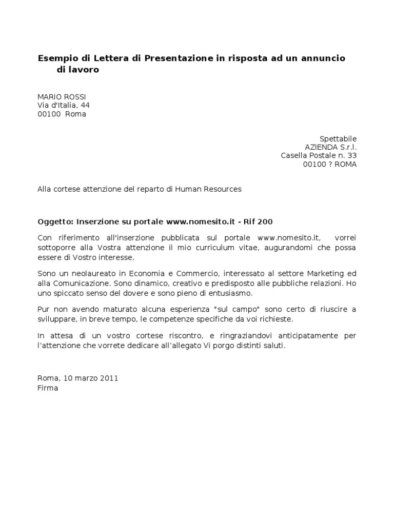 Lettera Di Presentazione in Risposta Ad Un Annuncio | PDF - Scribd con riferimento al Vostro annuncio pubblicato sul medesimo portale del 29/06/2018 vorrei sottoporre alla Vostra attenzione la mia candidatura in quanto ritengo di possedere i requisiti richiesti per ricoprire il ruolo vacante. Sono dipomato in elettronica e telecomunicazioni e grazie a precedenti esperienze lavorative sono riuscito ad