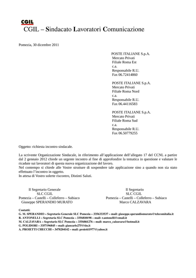 Richiesta d'incontro urgente per un confronto su varie ... - SIULP Richiesta d'incontro urgente per un confronto su varie problematiche di stretta attualità 28 Febbraio 2014 1511 Riportiamo il testo della richiesta di incontro inviata, dal cartello sindacale, al Ministro dell'Interno Alfano "Signor Ministro, richiesta incontro sindacale fac simile - Studio Savini richiesta incontro sindacale fac simile 2403-bis, 2° comma, del Cod. verbale accordo sindacale e azienda edile Buongiorno, le aziende edili (artigiane) secondo voi sono abbligate a firmare e presentare accordo sindacale per richiesta di cig con motivazione mancanza di lavoro. Fac Simile Richiesta Incontro Sindacato Azienda - Moduli Lavoro Di seguito si trova il modello richiesta incontro sindacato azienda editabile da scaricare sul proprio computer. Una volta che il documento è stato scaricato, bisogna aprirlo con un programma che supporta i file in formato Word e compilarlo inserendo quelli che sono i dati richiesti.